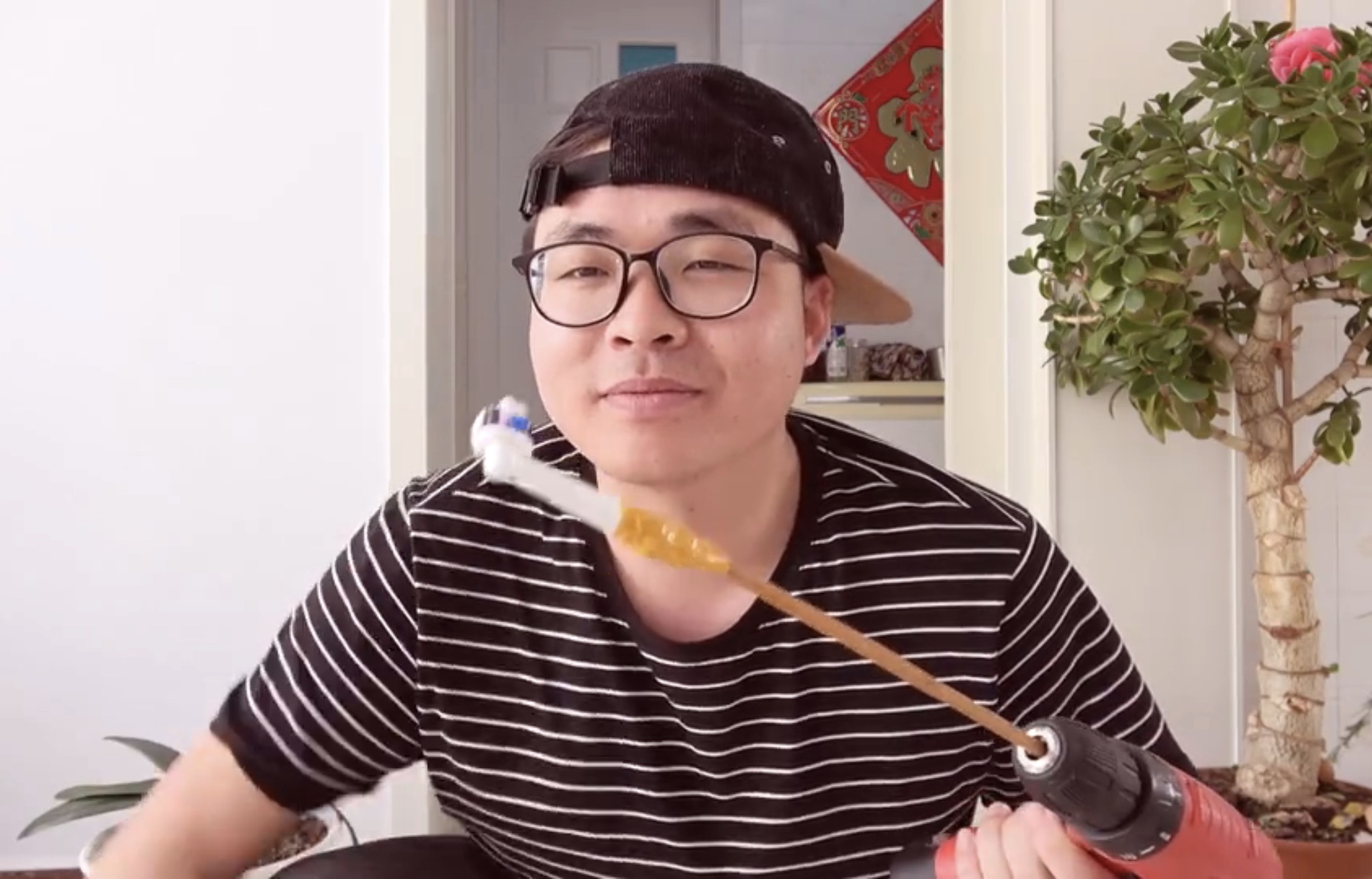 2018年夏天,东北农村小伙王大隆上传了一则Vlog。他把一个传统牙刷一截为二,中间接上玩具四驱车的马达和电池,制作了一个土味旋转电动牙刷。