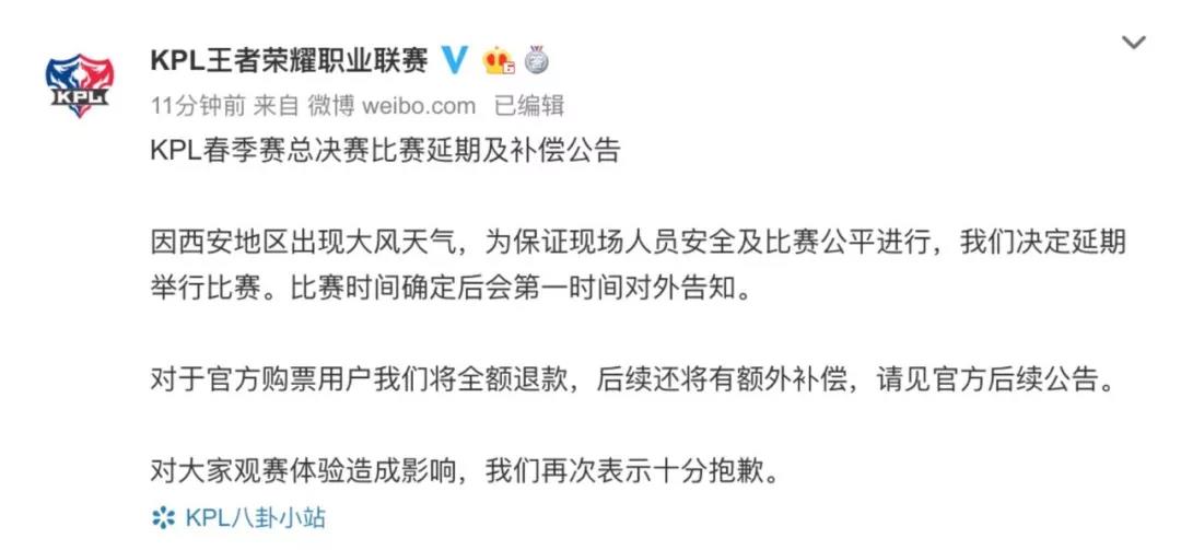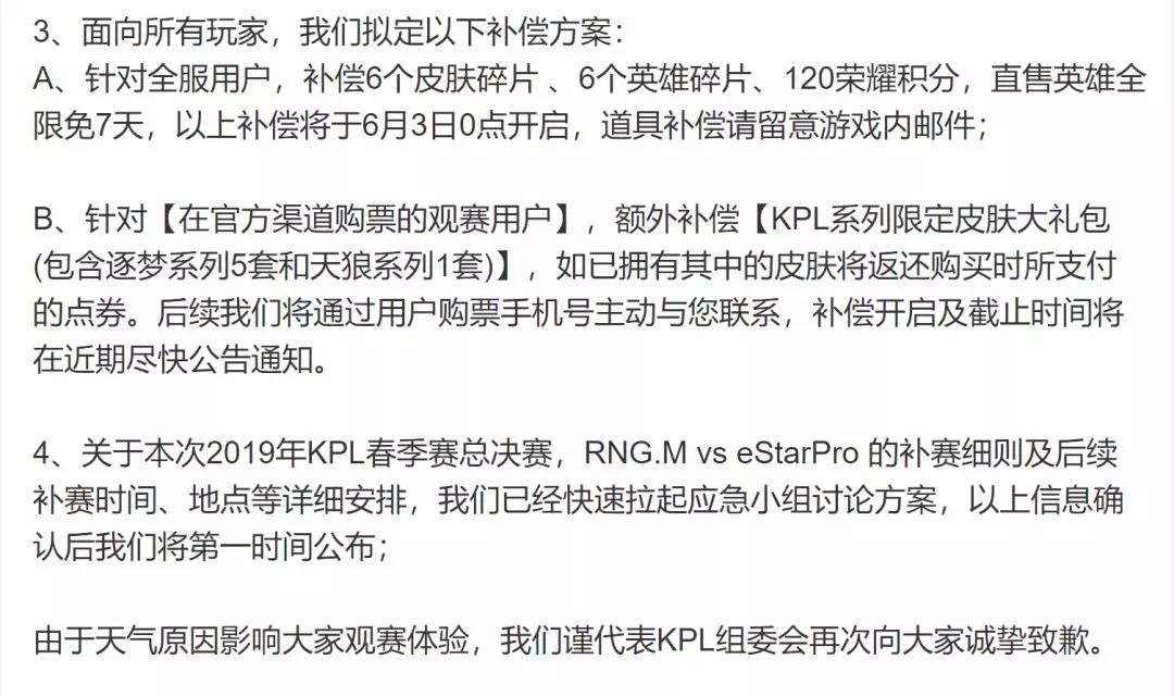 1个小时后,KPL官方快速反应发布声明,宣布了本次赛事延期的消息,并为购票观众进行全额退票。稍晚时分,赛事方还发布了额外的补偿方案,给购票观众额外补偿6个KPL系列皮肤(大约价值人民币400元),同时还给全服用户补偿了一定的游戏道具。