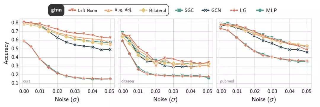 图4:Cora(左)、Citeseer(中)和Pubmed(右)数据集上的基准测试精度。噪声水平通过在特征值上增加白噪声的标准差来测量。