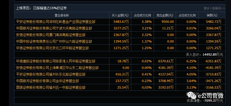 盘后交易信息显示,此次砸盘主力是中信建投张家港人民中路营业部、安信证券上海黄浦区中山东二路营业部、平安证券福州长乐北路营业部、银河证券金华营业部、国信证券福州五一中路营业部,卖出金额分别为6370.61万元、4181.39万元、4127.04万元、3708.99万元、3192.07万元。