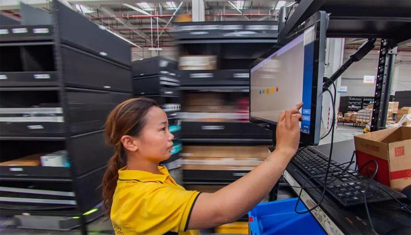 在自动化分拣线,一个个空置的黄色料箱带来到工人面前,工人根据指示灯和亮起的数字将商品放入料箱,几秒钟就可以完成分拣。