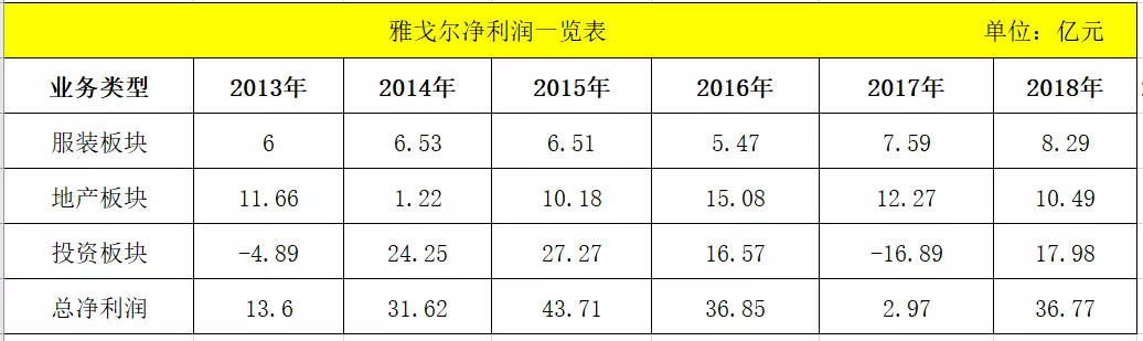 但不管怎样,多年来,投资业务的利润表现都是最为亮眼的。从2013-2018年的对比数据可以看出,在不亏损的情况下,投资业务的利润贡献都远超服装和地产业务。
