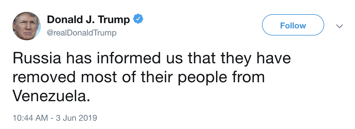 但特朗普当天在推特上发布的一段内容与扎耶姆斯基的说法相左,他写道,“俄罗斯已知会我们,他们已召回了派往委内瑞拉的绝大部分人员。”不过,特朗普并没有具体说明消息的来源及文中的“人员”所指,他现正在英国进行国事访问。克里姆林宫目前还未对特朗普的说法予以更多回应。