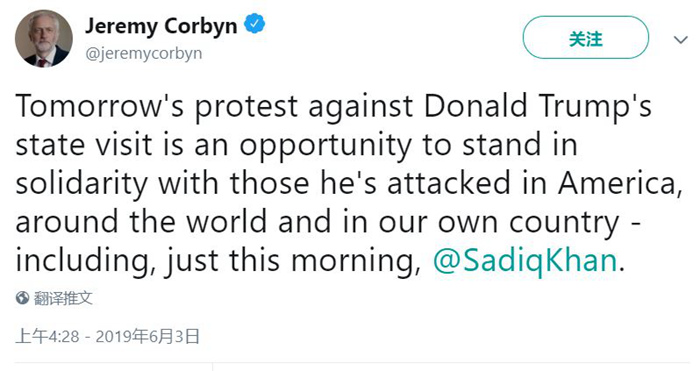 为了表示抗议,科尔宾拒绝参加周一晚为欢迎特朗普举行的国宴。科尔宾在Twitter发文称,周二的游行是为了支持被特朗普攻击过的人,包括“萨迪克·汗”。