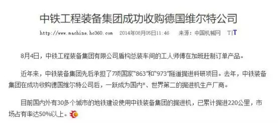 2014年,中铁装备收购了德国的维尔特公司。德国人之所以青睐中铁装备,是因为中铁装备有技术、有雄心,能够把维尔特的掘进机品牌继承并发扬光大。