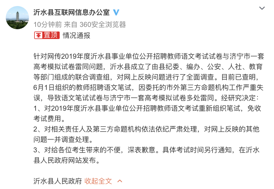 针对网传2019年度沂水县事业单位公开招聘教师语文考试试卷与济宁市一套高考模拟试卷雷同问题,沂水县成立了由县纪委、编办、公安、人社、教育等部门组成的联合调查组,对网上反映问题进行了全面调查。目前已查明,6月1日组织的教师招聘语文笔试,因委托的市外第三方命题机构工作严重失误,导致语文笔试试卷与济宁市一套高考模拟试卷多处雷同。经研究决定: