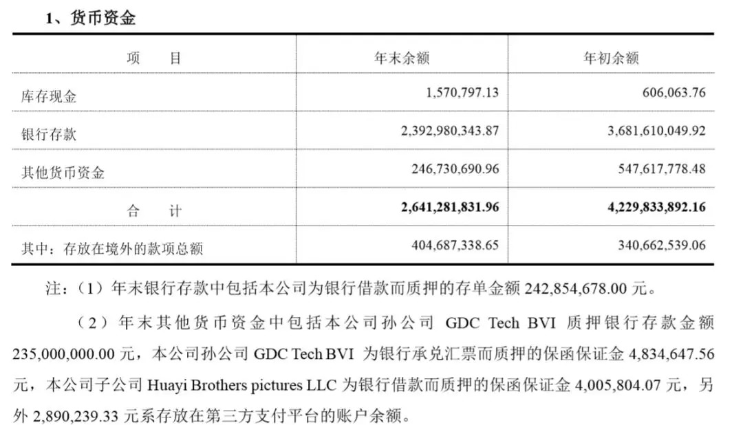 目前,华谊的货币资金还有26.41亿元,但其中的库存现金只有157万元,扣除2.4亿被质押的银行存款,和2.47亿被质押的其他货币资金,华谊能够动用的账上资金只有19亿左右,这里面还包括了其他公司给到的12亿预收款。