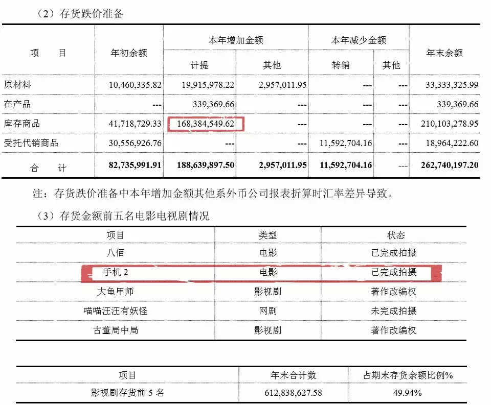 这是哪部作品?在价值6亿的前5名大存货项目中,已经完成拍摄的只有《手机2》和《八佰》,而后者已经确定了要上映。因此,这笔1.68亿元的存货跌价计提,大概率正是针对《手机2》。