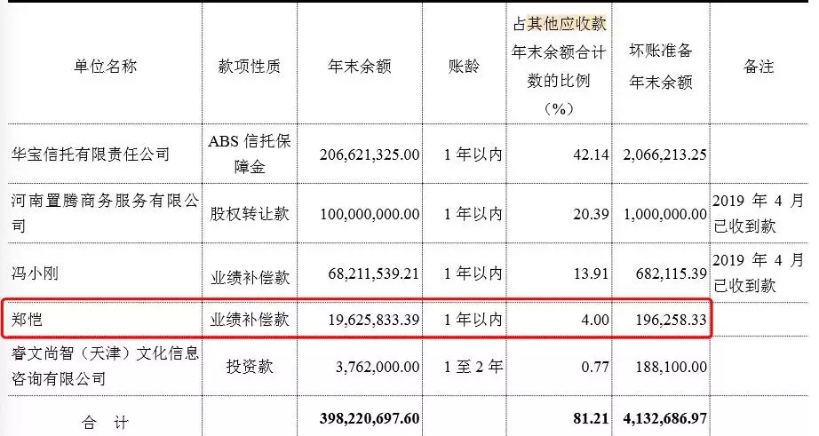 有意思的是,冯小刚与郑凯因为业绩未达标而需要向华谊分别偿还6821万元和1963万元的业绩补偿款,其中冯小刚的欠款已于今年4月收回,而郑凯尚未还款。