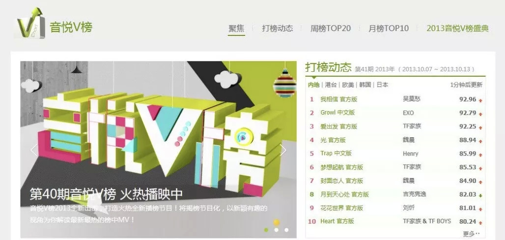 《超级女声》的李宇春、张靓颖和周笔畅,《快乐男声》的魏晨,一直是音悦V榜的热门选手。直到2014年TFBOYS在“第二届音悦V榜年度盛典”夺得最具人气歌手后,国产偶像在音悦台的权力格局开始发生变化: