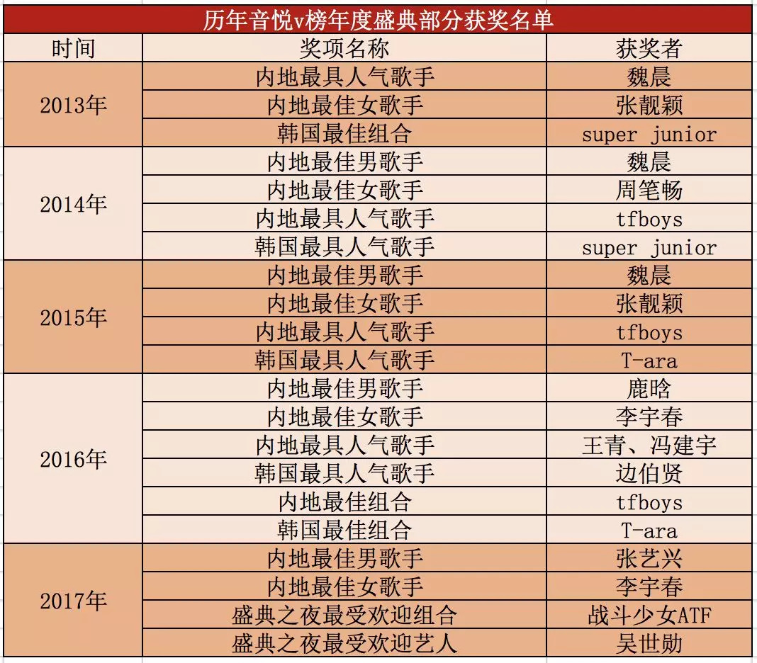 截至2017年,“音悦V榜年度盛典”一共举办了五届。结合入围名单和获奖人员来看,Super Junior、f(x)、T-ara和EXO四大偶像团队始终有较高人气,基本契合当时的内地韩粉格局。2012年,SM公司正式推出EXO偶像男团。该团迅速火遍东南亚,开拓了广阔的海外市场,韩国男团霸主的位置也由单飞的Super Junior移交至EXO。