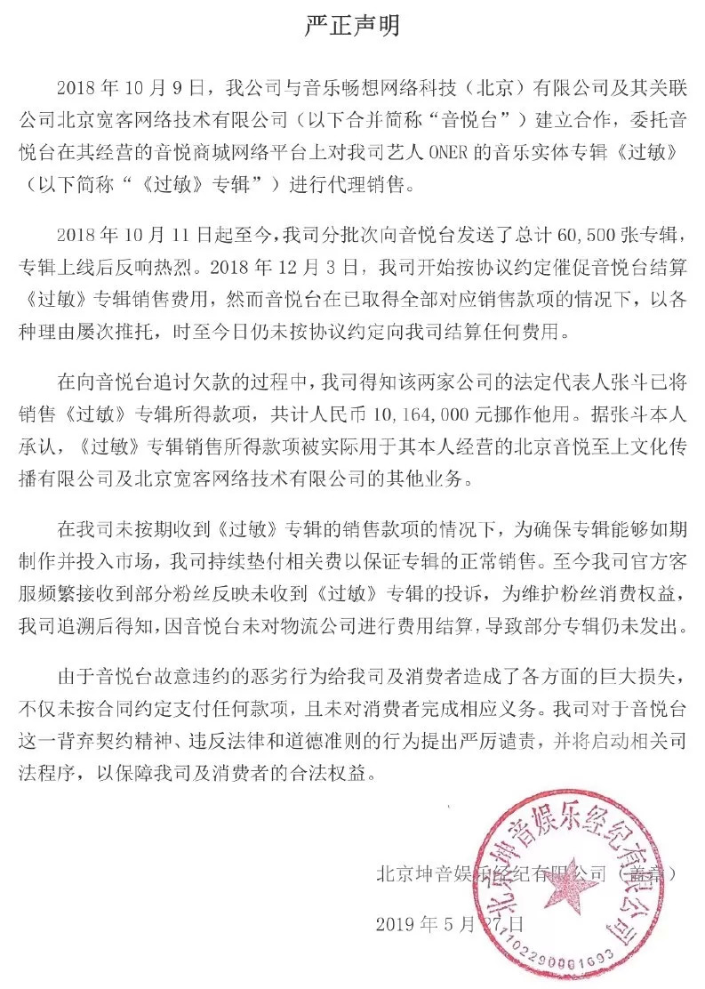 5月27日,坤音娱乐官博上演在线追债。声明指出:音悦台拖欠自家男团oner实体专辑销售款1000多万;双方协商数月无果,音悦台法人代表张斗承认已将款项挪用至公司其他业务;同时,由于音悦台未和物流公司结算费用,导致部分专辑至今未能送到粉丝手中。
