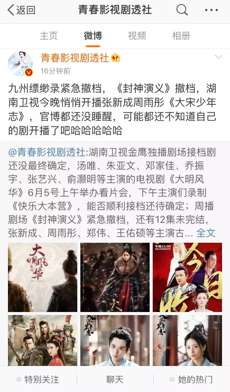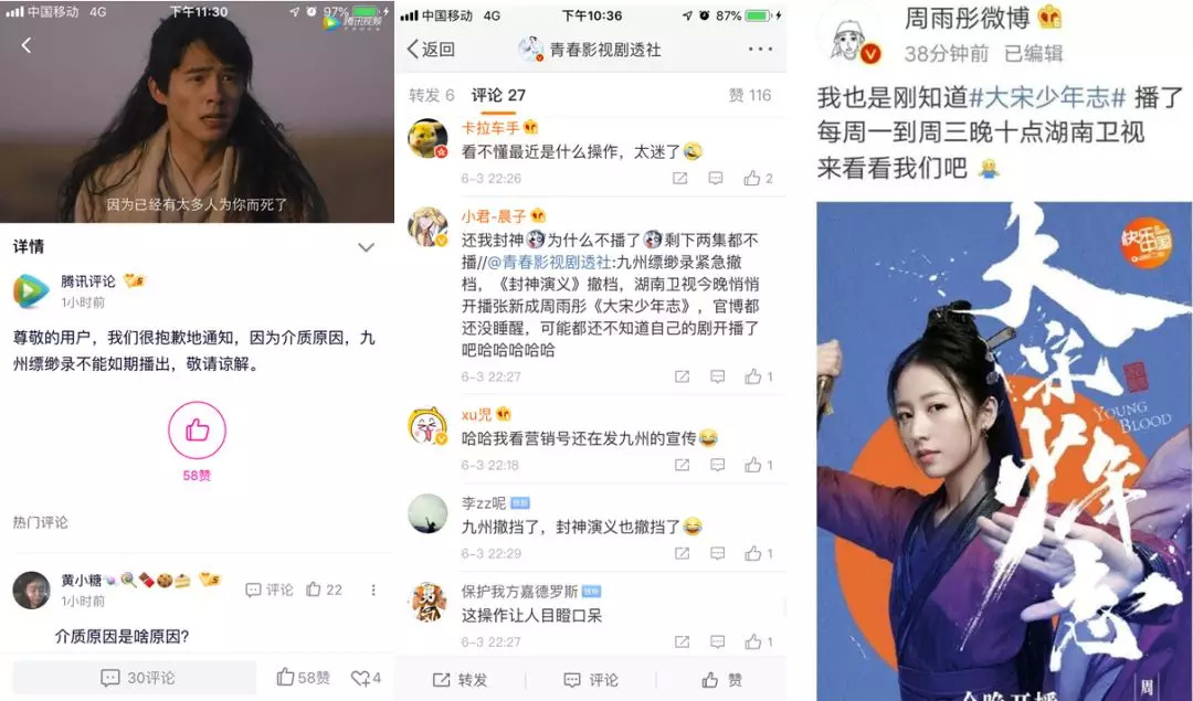 紧接着一瓜未平一瓜又起,《九州缥缈录》撤档后,就连湖南卫视当晚播出的《封神演义》大结局也不翼而飞了;最后原以为《网球王子》会接档,谁知全网无任何宣传的《大宋少年志》就这样开始了裸播,直到播出后主演们才一脸懵逼的开始宣传。
