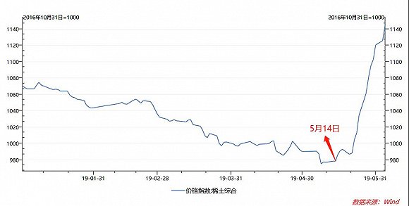 包头稀土产品交易所编制的中国稀土综合价格指数显示,在经历2019年一季度的下滑之后,5月8日起,国内稀土价格开始企稳,并于5月15日出现大幅上涨。截至6月5日,不到一月内,该指数已从978.31点一路涨至1125.82点。