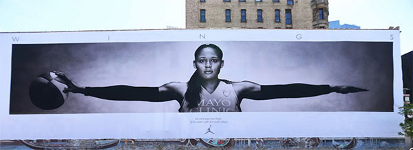 2018年5月,Jordan品牌曾在美国明尼苏达州悬挂起一幅玛雅·摩尔的巨幅广告。广告中,她做出手握篮球张开手臂的姿势,这也是迈克尔·乔丹标志性的动作之一,引起外界的热烈围观。