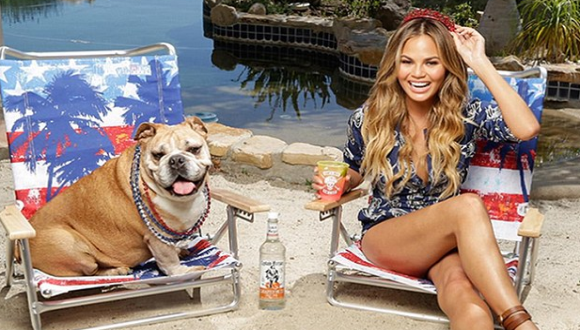 克丽丝·泰根也在独立日进行庆祝活动。这位29岁的长腿美女分享了一张照片。照片中,她坐在靠近池塘边的红白蓝三色海滩椅上,手拿一杯葡萄柚朗姆酒,冲着镜头开怀大笑,右边的宠物狗则戴着红白蓝三色珠圈。