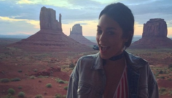 26岁的凡妮莎·哈金斯身穿国旗样式的上衣,披了一件牛仔外套。她的身后则是令人赞叹不已的奇石景观。她在Instagram上写道:“节日快乐!”