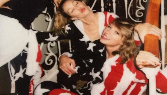 7月4号这天,霉霉和吉吉·哈迪德绝对是超级爱国者。这天,二人身穿美国国旗连衣裙,一边红白条纹,另一边则是蓝底白星。