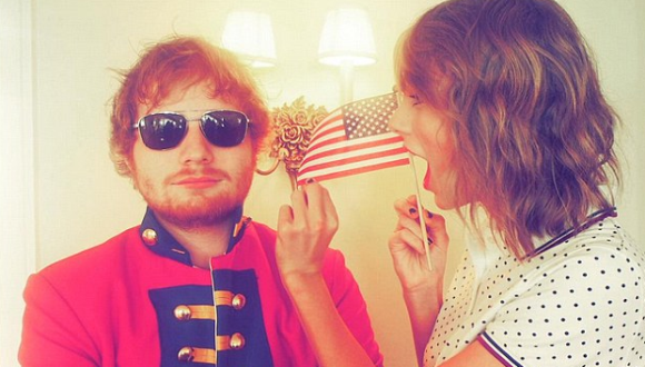 歌手爱德华·希兰于周六到达泰勒家。这位英国歌手身穿一件红色军夹克,这款式的衣服似乎是独立战争期间,与美国作战的英国士兵所穿。