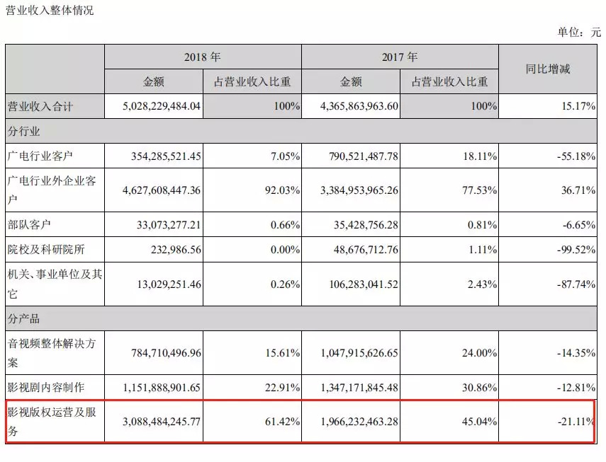 虽然公司在影视版权运营及服务的营收相较2017年的19.6亿元提升超过10亿元,但是蹊跷的是,在年报的同比增减上,本应是57%的营收业绩增幅,显示出来的比例却是降幅超过21%。