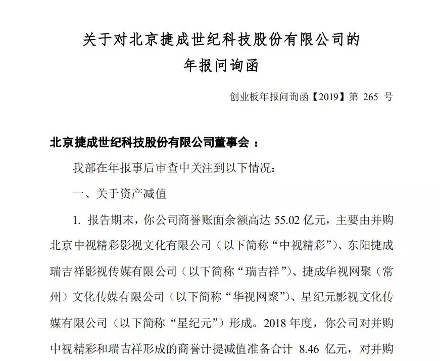 5月20日,深市创业板公司管理部给捷成股份(SZ.300182)发送了年报问询函,针对商誉减值是否充分、应收账款增长幅度为何远高于营业收入增幅、坏账计提,甚至年报中的乱码以及低级的数据错误,足足追问了16个问题。