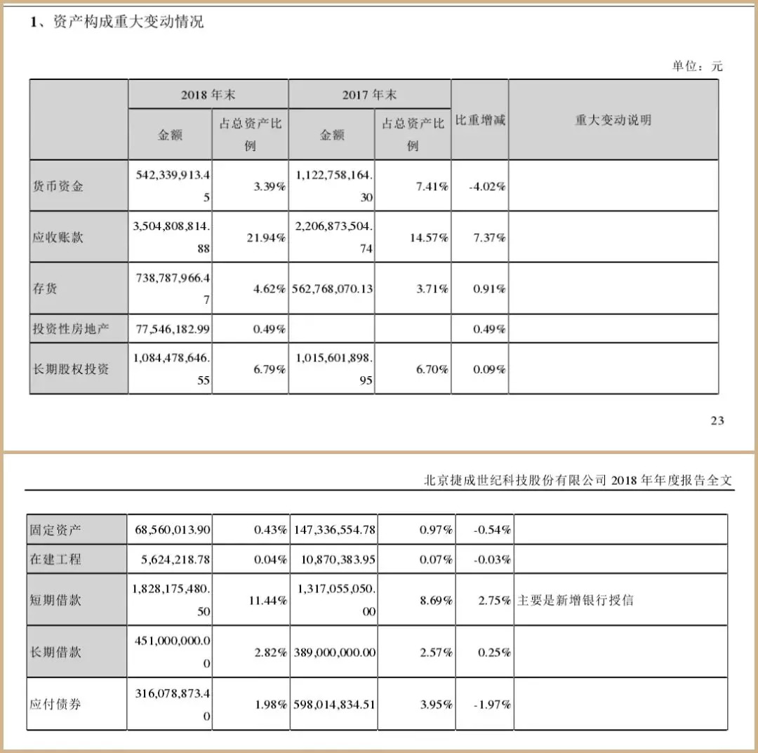 只不过,在捷成股份的2018年“资产构成重大变动情况”中,除了短期借款有所说明,其余资金情况变动并没有进行解释,捷成股份反而将这些数据与2018年的总资产占比来进行比较,而非2017年的数据。这样处理,货币资金、应收账款等一些相较2017年变动幅度超过50%的数据,看起来似乎变化都不大。