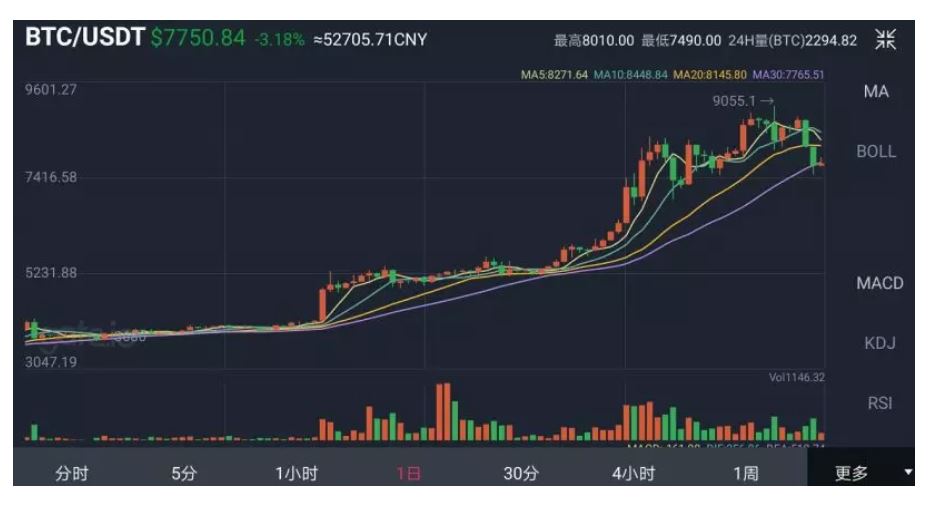 5月1日,比特币价格最低为5320美元,5月4日,拉升突破6千美元大关,随后连接突破7000、8000美元关口,5月31日凌晨,再次急剧拉升突破9000美元,15分钟后迅速回落,当晚波动巨大,最低价不足8000美元。