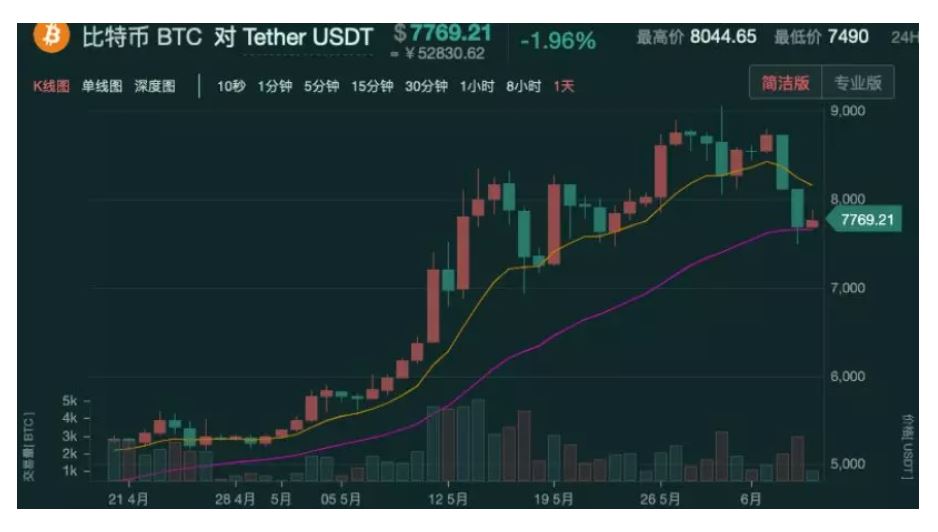 相较于5月份的单边上扬,从6月份目前的走势看,比特币价格在冲高后开始回落,目前价格已跌破8000美元。