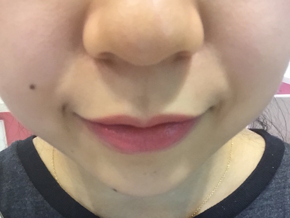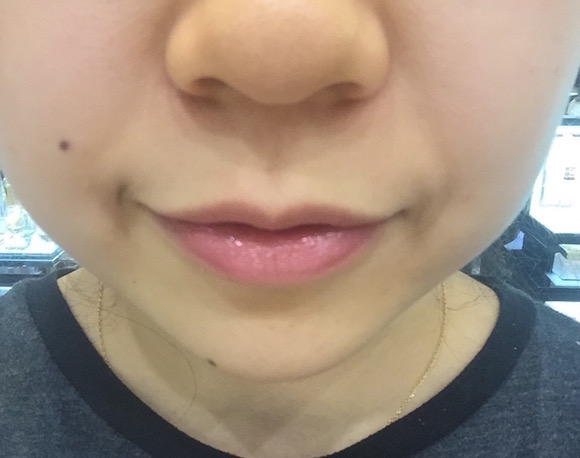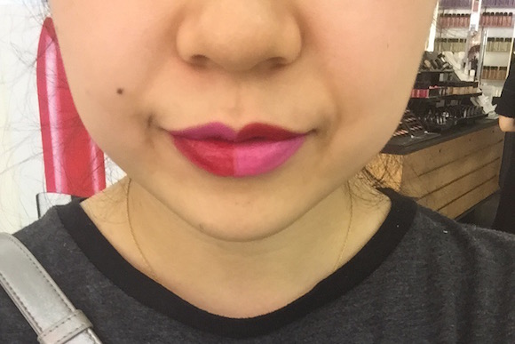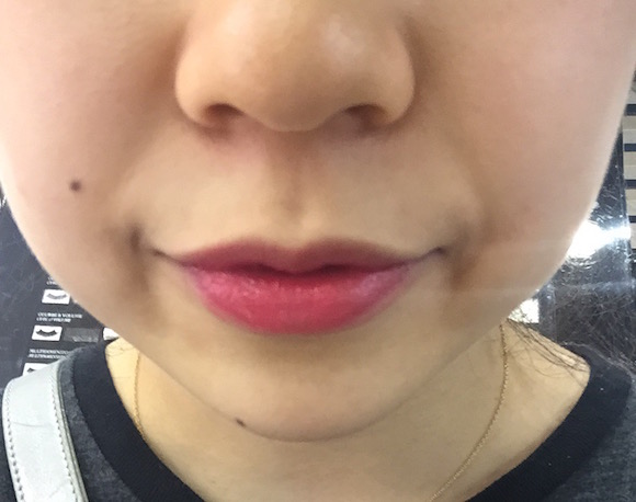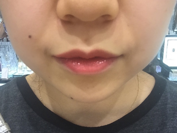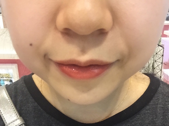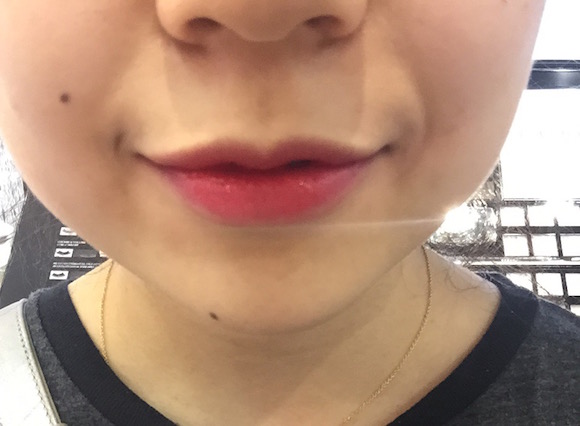 记者试的是导购“热力推荐”的最红款754和479,据说几乎要卖断了。实际上,#754偏红,#479偏粉,但由于这款液体唇膏整体还是偏透,所以上唇效果区别不是特别明显。