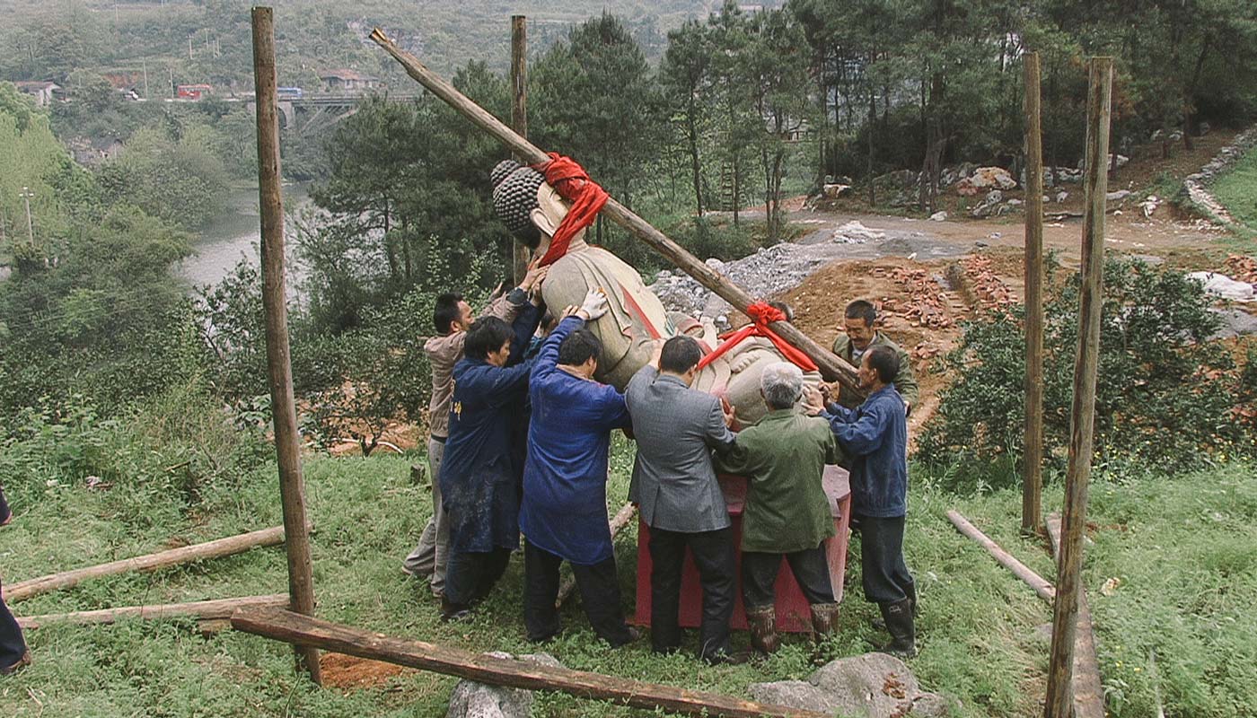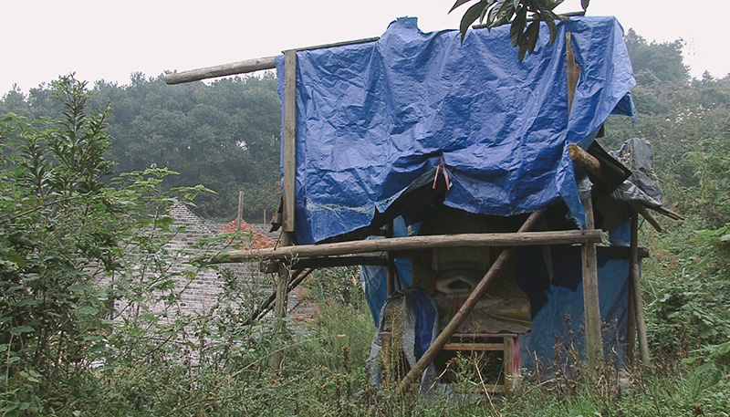 七八个人一起奋力地抬着佛祖,颤颤巍巍地往不远处的山腰走去——那里是重建留云寺的新址,已经用石灰粉画出粗粗的地基标线,像一块刚刚翻垦等待播种的菜地。村民们将释迦摩尼放在一块空地上,坐北朝南,然后用油布搭起一个简陋的临时棚子。没有门窗,四面通风,只有四根柱子撑起一个薄薄的屋顶——但已经足以为佛祖遮雨蔽日。这就是释迦摩尼临时的家园,在接下来的一年多时间内,它将孤独地立在这里,默默地看着山脚下向东而流的龙门溪,看着对面的山峦一点一点地被推倒,渐渐凿出一条大路的雏形。
