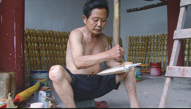 窝棚工厂里暑气逼人,一片逼仄和凌乱不堪。一扇木板隔开成两个区域。里面的一个小房间,没有窗户,光线幽暗,摆放着一张床和几个柜子,那就是粟师傅的卧室。另一片较大的不规则空间就是“雕刻车间”,地面上堆放着好多木材和几个未完工的佛像,到处散落着木屑和木花。一名中年男子正光着膀子埋头在木工台上,用刨子打磨着一根木头,汗珠从他的背上不断地渗出来。