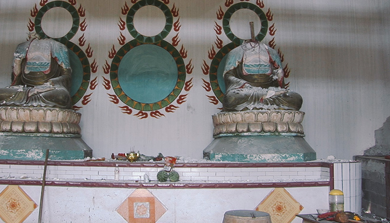 大雄宝殿里剩下的菩萨,则被乡民们抬到了天王殿里。它有幸不在红线范围之内,可以暂时不拆。天王殿小很多,原本是四大天王的居所——增长天王、广目天王、多闻天王、持国天王,他们是佛教中的守护神,手上拿着各种法器,看起来面目狰狞凶狠,但代表良善和正义。他们慷慨地敞开了自己的大门,收留了观音菩萨、地藏菩萨等一干无家可归的邻居,一起分享着这原本逼仄的空间。