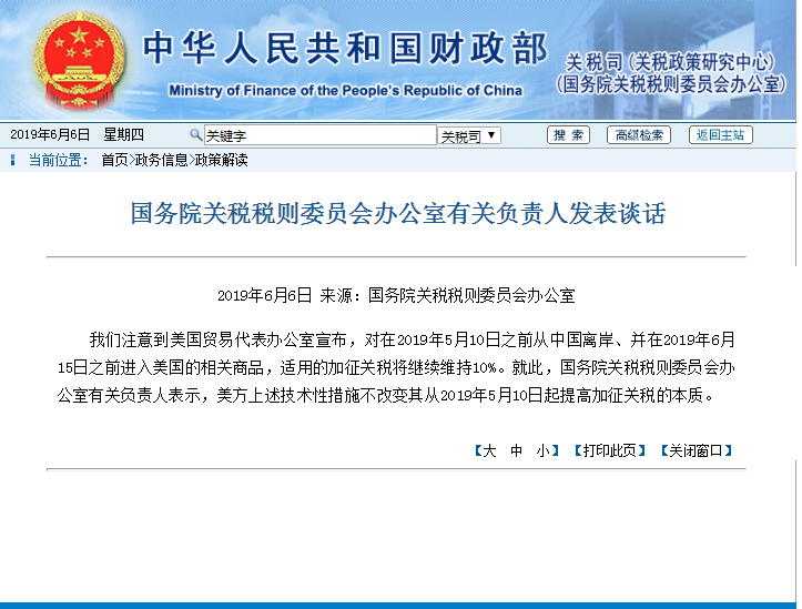 据财政部网站6月6日消息,国务院关税税则委员会办公室有关负责人发表谈话指出,我们注意到美国贸易代表办公室宣布,对在2019年5月10日之前从中国离岸、并在2019年6月15日之前进入美国的相关商品,适用的加征关税将继续维持10%。