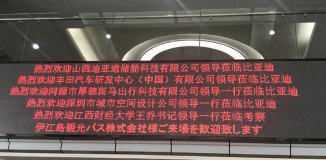 同时,比亚迪办公大楼屏幕上也写着“热烈欢迎丰田汽车研发中心(中国)有限公司领导莅临比亚迪”等内容。