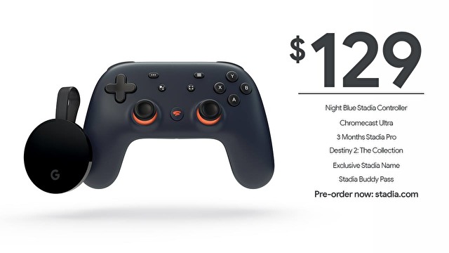 目前开放预购的创建者版本包含一个暗夜蓝限量版本Stadia手柄、一个ChromeCast Ultra流媒体设备、两份3个月的Stadia Pro会员订阅资格以及《命运2:收藏版》等内容。