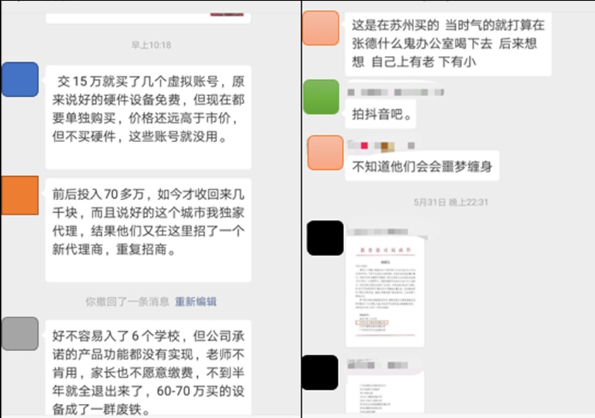 除了校园设备供应商,代理商中还有很大一批人是老师和公务员。他们都是自认为有资源进入学校的人,但很多人斥巨资加盟后,迎来的不是躺着收钱,而是巨亏甚至被取消代理资格。