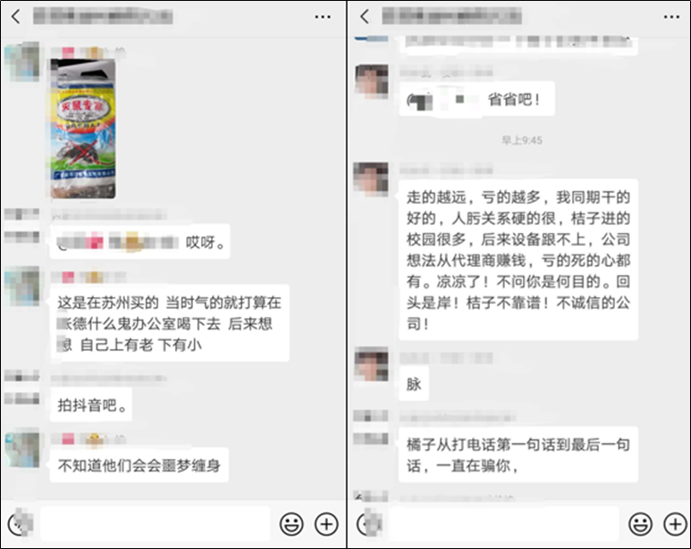 但对于代理商来说,一切都为时已晚。在维权无果后,一些投资额较大的代理商甚至有了过激的想法。一位代理商就在微信群里说,“这是在苏州买的(灭鼠药),当时气的打算在他们老板办公室喝下去,后来想想,自己上有老,下有小。”