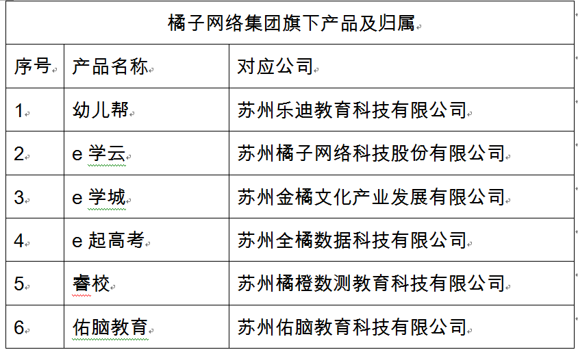 据苏州橘满天下网络科技有限公司(下称“橘满天下”)官微,橘子网络集团成立于2013年,历经五年多稳健经营和发展,已逐步成长为K12教育全产业链的综合运营商;旗下项目包含幼儿帮、脑科学、e学云、e起高考、睿校、e学城、佑脑教育几大系列产品,这些产品分别属于不同的公司主体。而除了这些公司之外,橘子网络集团还设置了若干投资公司,层层嵌套,十分复杂。