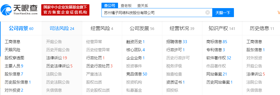 天眼查显示,橘子网络目前涉及法律诉讼19起,遭到行政处罚3次。这或许是2018年1月之后橘子网络集团将宣传重点改为橘满天下的部分原因。