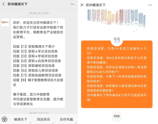 据一位代理商透露,橘子网络之前的产品名叫“幼儿帮”,后来又推出“e学”、“e学云”、“e学城”等。几个产品加起来在全国有约2300名代理商,大部分代理商的投资金额在15万元以上,部分代理商做的是省级独家代理,费用逾百万元,而e学城的代理门槛则是500万元起步。即便按照所有代理商投资15万计算,该公司至少涉及金额超3亿元。