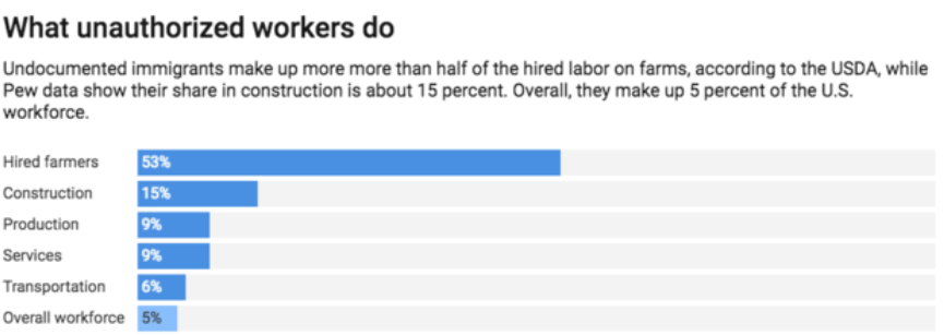 目前,美国约一半的非法移民来自墨西哥。但曾获白宫突出贡献奖的康纳尔大学学者达德利(Mary Jo Dudley)指出,这些非法移民为美国带来了不可或缺的廉价劳动力。农业部数据显示,美国农场中超过一半的工人属于非法移民。农业工作往往是美国公民最不愿从事的一项工作,因为农活体力繁重、又苦又脏,也缺少社会认同。