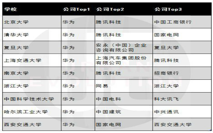 再来看一下C9毕业生就业单位情况。九所院校就业榜单Top1均是华为。此外,腾讯也表现不俗,在C9 Top3雇主名单中上榜4次。