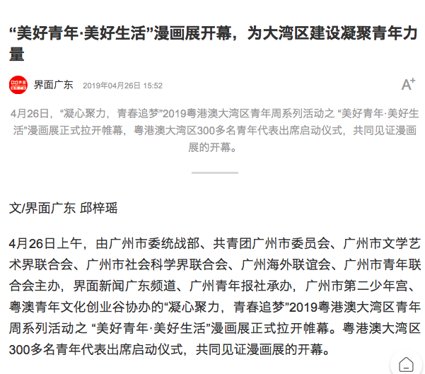 4月26日,界面新闻广东频道作为承办单位之一,在广州市第二少年宫、粤澳青年文化创业谷举办“凝心聚力,青春追梦”2019粤港澳大湾区青年周系列活动之 “美好青年·美好生活”漫画展。此次画展展出的近300幅小林漫画作品,通过漫画艺术传递传播文化正能量,不仅更容易获得年轻人情感的共鸣,还能更好地凝聚青年力量,推动 “人文湾区”的建设。