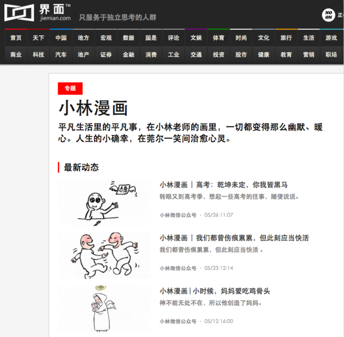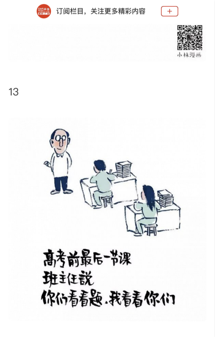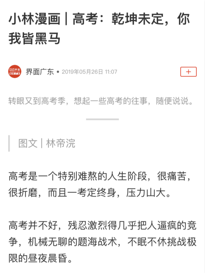 此外,界面新闻广东频道还为小林老师开设专栏,小林老师作为界面新闻广东频道专栏作家,持续亲自分享更多优秀的作品与人生的感悟。5月26日,本次高考作文试题作品就出现在小林老师专栏“小林漫画 | 高考:乾坤未定,你我皆黑马”一文中。