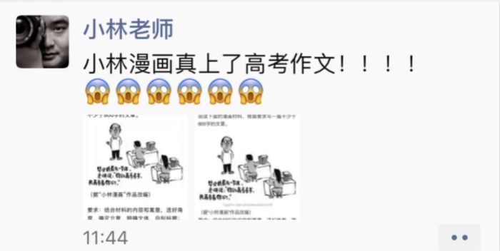 林帝浣:因为模拟题的时候已经出过漫画题,所以我觉得高考有可能也会出现漫画题。但是知道后作品真正成为高考作文题的时候我还是比较意外的,非常荣幸。