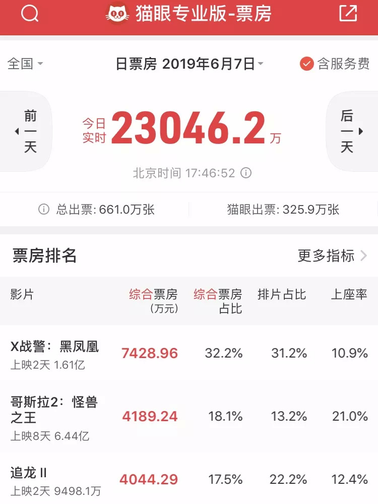 然而今年端午档的惨淡,又岂止是被高考抢了风头。昨日(6月6日),端午新片已悉数登场,总票房仅1.88亿。关键是口碑齐衰,《X战警:黑凤凰》和《最好的我们》豆瓣评分还勉强站住6,《追龙2》索性直接跌到5.8去了,让人难以看好后势。已上映一周的《哥斯拉2》,今天(6月7日)就已重回单日票房亚军的宝座。