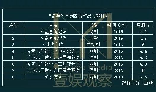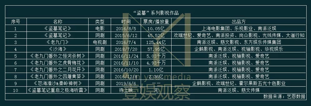从“盗墓”系列影视作品统计表中可见,2015年首部《盗墓笔记》网剧由欢瑞世纪、爱奇艺、南派投资、尚众影视、光线传媒、大道行知联合出品,目前正在热播的《怒海潜沙&秦岭神树》,出品方则为企鹅影视、欢瑞世纪和霍尔果斯五光十色影业三家公司。