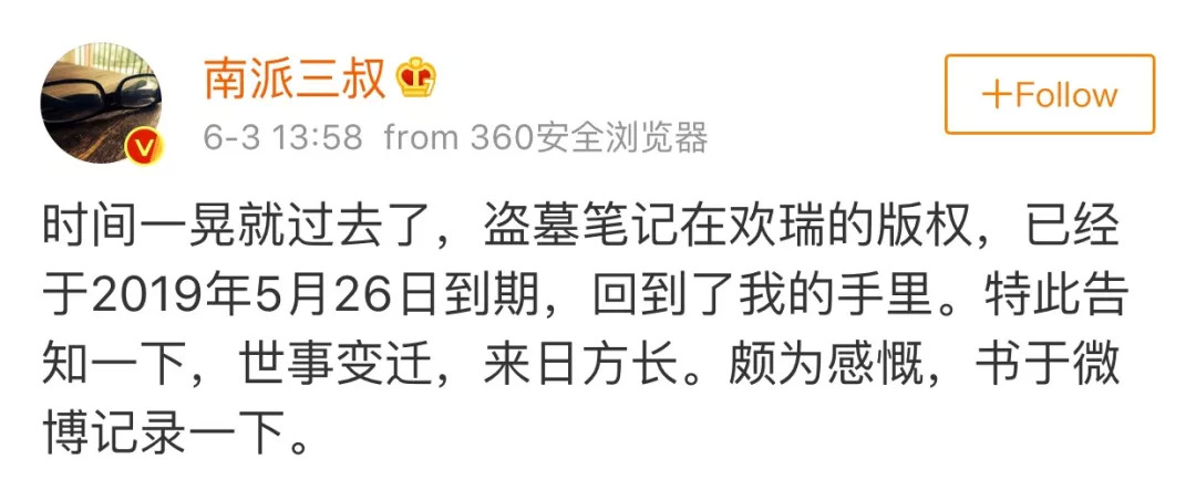 《怒海潜沙》根据《盗墓笔记》改编,作为原著作者,南派三叔(以下简称“三叔”)在原著粉心中有着不可撼动的地位,加之他旗下的南派泛娱有限公司(简称“南派泛娱”)曾提出要做“盗墓宇宙”,更令原著粉们对《盗墓笔记》系列IP的每一次影视化都格外关注,但从已经上映的多部作品看效果并不理想。因此在《怒海潜沙&秦岭神树》宣布定档的当天,三叔一则“版权回归”的微博虽令原著粉“欢呼雀跃”,却也让某些行业媒体认为“有撇清自己与该剧之嫌”。