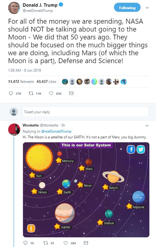 可惜,特朗普这条帖子下面点赞最多的一条评论在纠正他:月球是我们地球的卫星,不是火星的一部分,你这个大傻子。