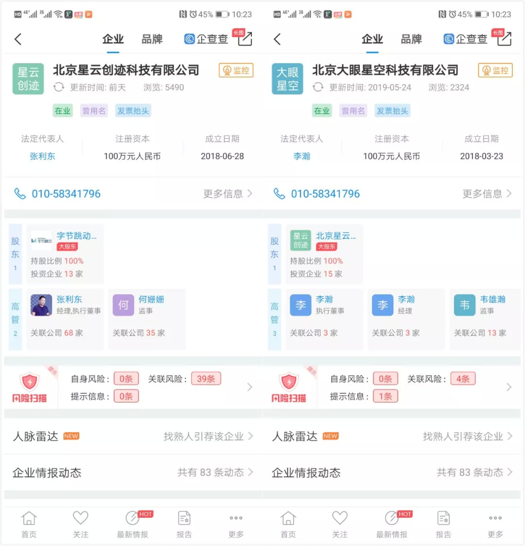 据了解,北京大眼星空科技有限公司成立于2018年3月23日,注册资本为100万元人民币,其由北京星云创迹科技有限公司100%控股。后者则是字节跳动有限公司100%控股,这就坐实了得特创新与字节跳动的股权关系。梁汝波则是张一鸣的大学同学,抖音开发者及运营商北京微播世界科技有限公司的创始人,现任字节跳动技术总监。